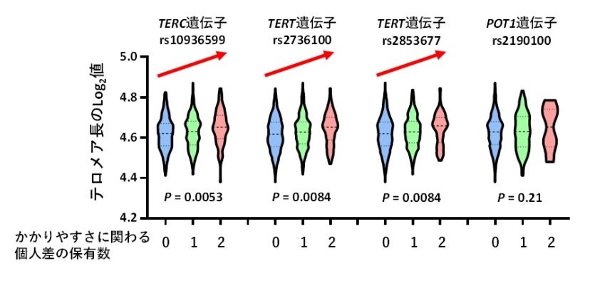 テロメアの長さを制御するTERC, TERT, POT1遺伝子の肺腺がんへのかかりやすさを決める個人差の保有数とテロメアの長さとの関係を示す。保有数の増加に伴うテロメア長の伸長の検定のP値を合わせて示す。