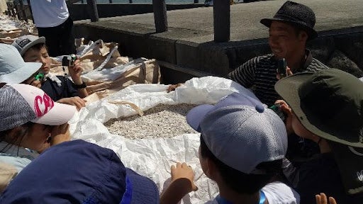 山から海へ、川を通して流れ込む栄養分に着目し、森づくりのために木を植え、塩ビパイプやワッシャーのサイズを変えることで、海に流れてごみにならないように自然に分解する素材を使っていることや、海底からの硫化水素を防ぐため、廃棄していた牡蠣殻を焼いて砕き、海底に撒き、水質改善に取り組んでいることなどを学びました。