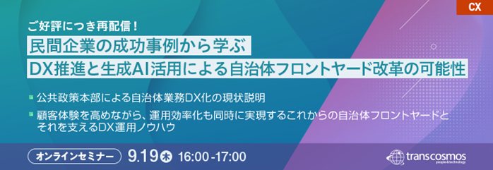 【トランスコスモスオンラインセミナー】【ご好評につき再配信!】民間企業の成功事例から学ぶDX推進と生成AI活用による自治体フロントヤード改革の可能性を9/19(木)に開催