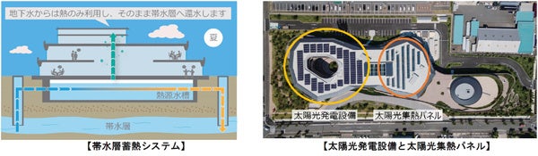 本施設では、地下水を建物の空調に利用する帯水層蓄熱システムなどの先進的な技術の導入や自然通風、昼光利用などによる徹底した省エネを図るとともに、屋根に配置した太陽光発電設備100kWや太陽光集熱パネルによる再生可能エネルギーの活用にも取り組んでいます。さらに、太陽光発電設備で賄いきれない電力は、当社グループが運営する発電所由来の実質再生可能エネルギー100%の電気を使用し、再生可能エネルギーによる自給自足を実現しています。