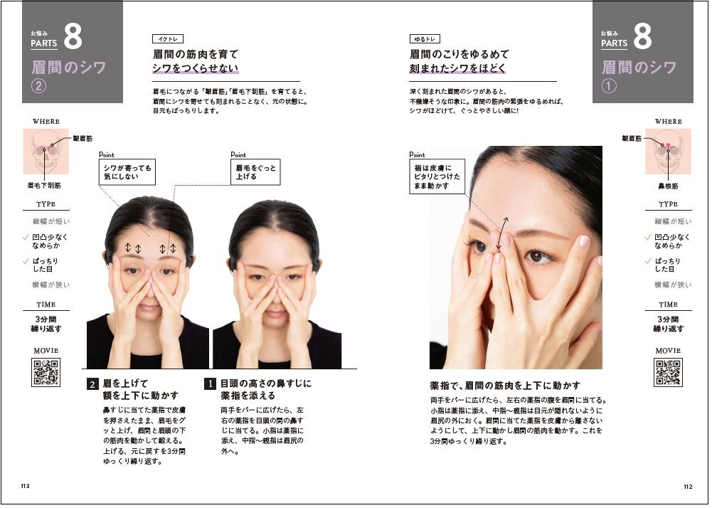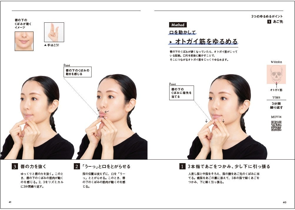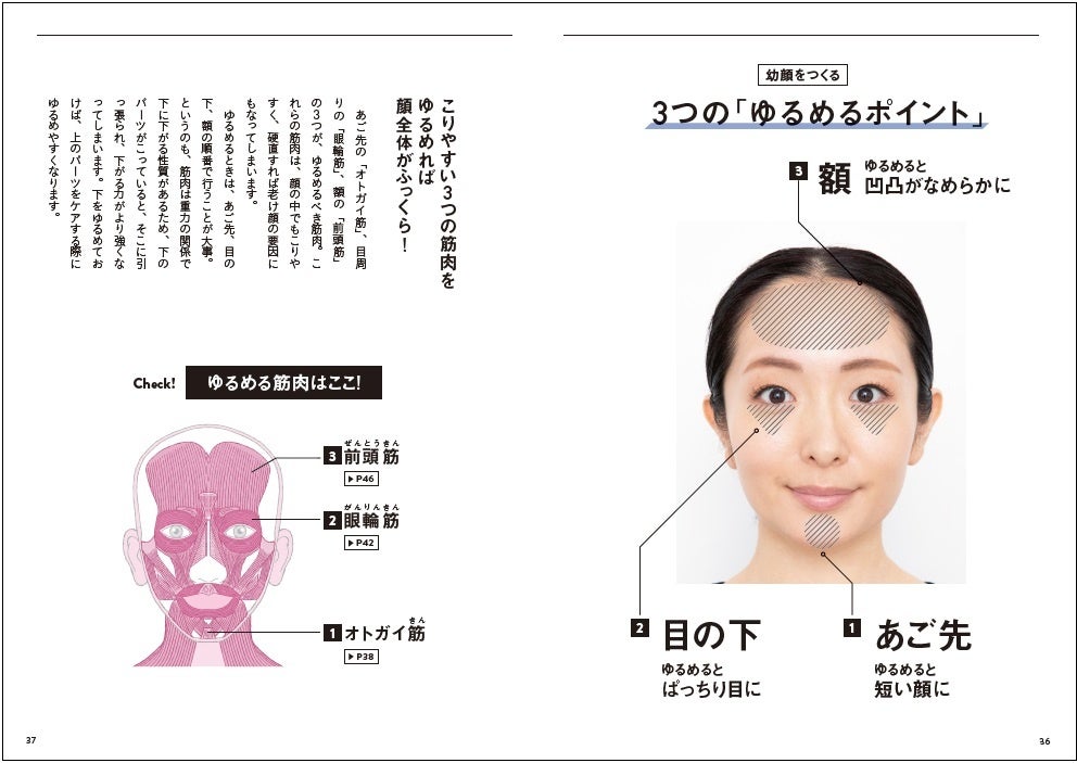 顔の「若返り筋」をのこりを「ゆるめ」、表情筋トレーニングで「育て」、思い通りに「動かす」ハウツーを教えるのが書籍『一生老けない顔になる 幼顔メソッド』です。
