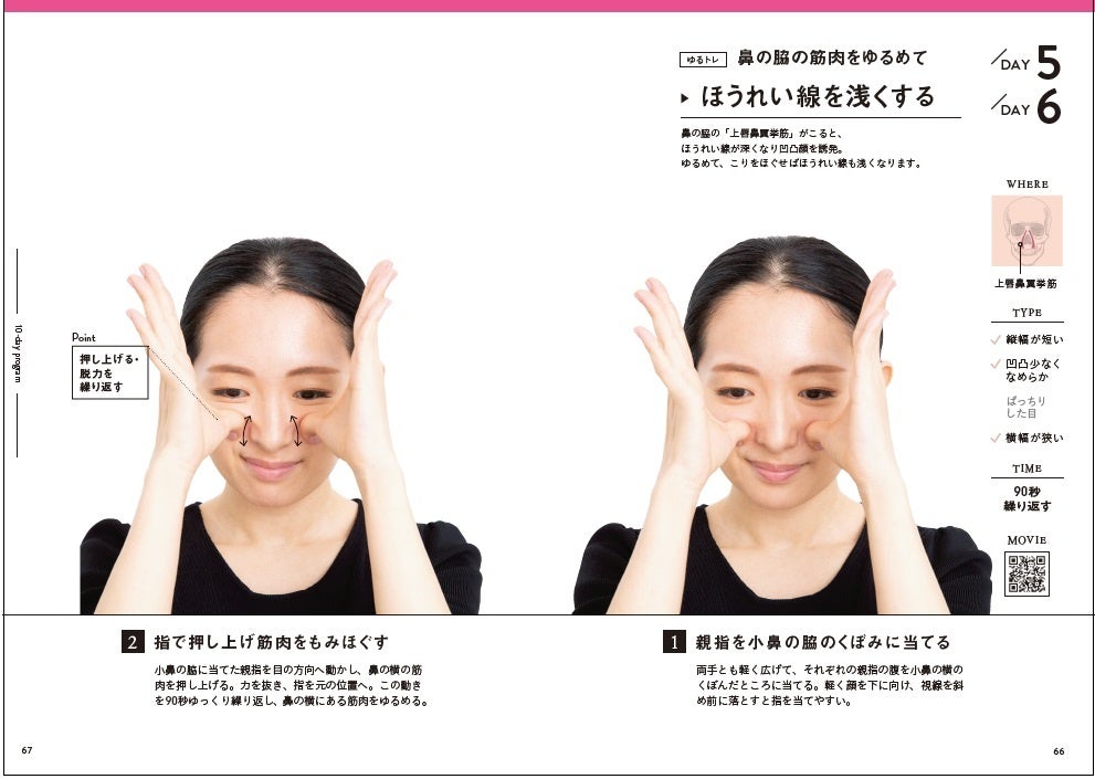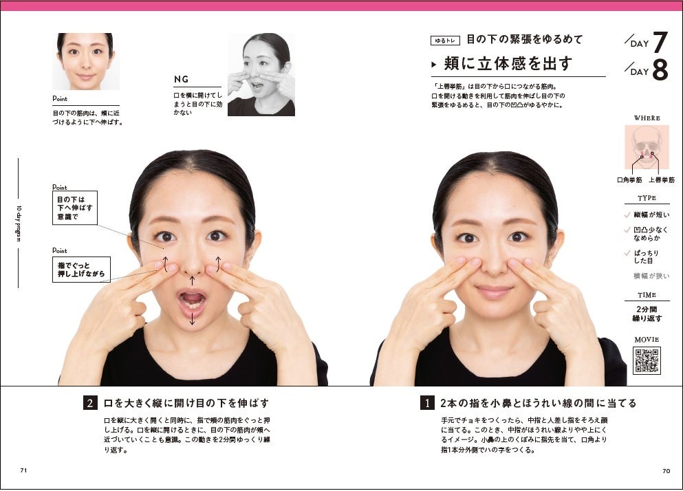 次に1日3分の「10日間プログラム」は、1日ごとに、こりやすく衰えやすい筋肉を「ゆるめる」+「育てる」の2つのメソッドがセットになっていて、10日後には、ほうれい線や口角の下がり、まぶたのたるみ、頬や目の下のくぼみなどの老け見え要因が改善します