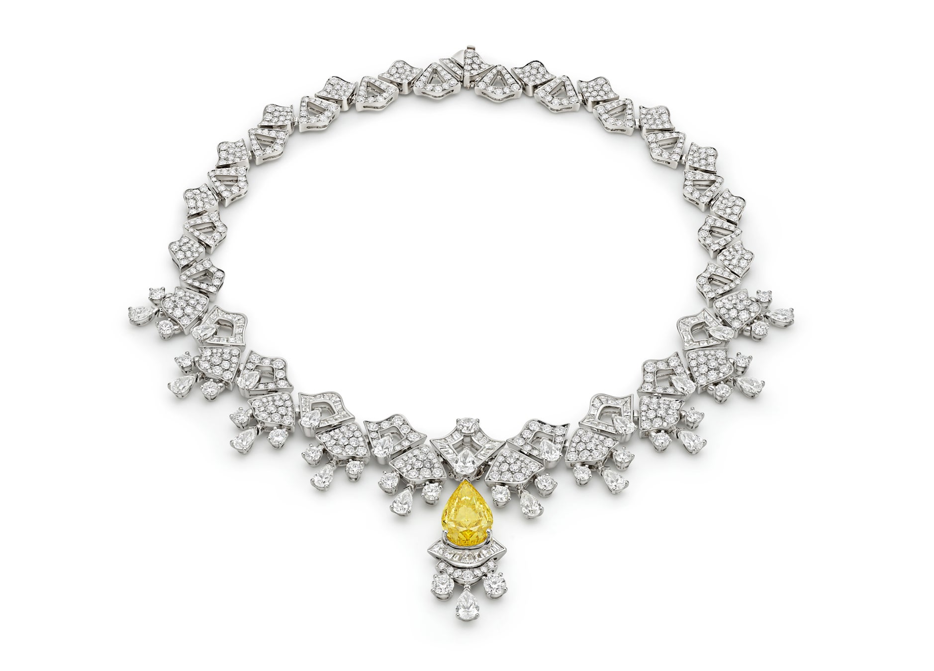 ネックレスの中心には、稀少で均一な色彩分布で高く評価される、並外れた8.02カラットのファンシー ヴィヴィッド イエローダイヤモンドが輝き、その周囲にはペア、ラウンド、ステップカットのダイヤモンドがまるで星のようにちりばめられ、全体のダイヤモンドの総数は35カラットを超えます。その配置は、アントニオ・カノーヴァの彫刻様式が持つ光り輝く純粋さと均衡の取れたプロポーションを想起させます。850時間以上の細心の職人技が生んだこのネックレスは、ヘッドを取り外せる仕様となっており、ブルガリが誇る多様な着用を可能にするハイジュエリーへのこだわりを示しています。