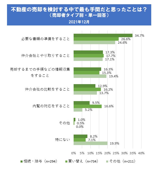 また、「売却検討時のローンの残額」にも大きな違いが。買い替えのための売却物件では「ローンの残額がなかった」が47.3%と半数に満たないところ、相続物件では79.6%。約8割が残債のない状態で相続しています。