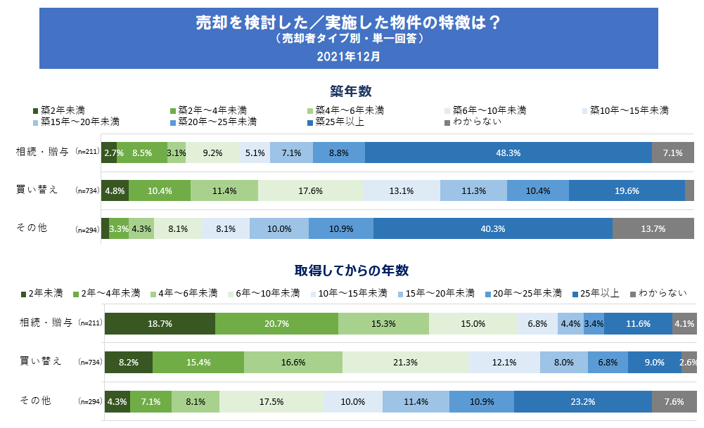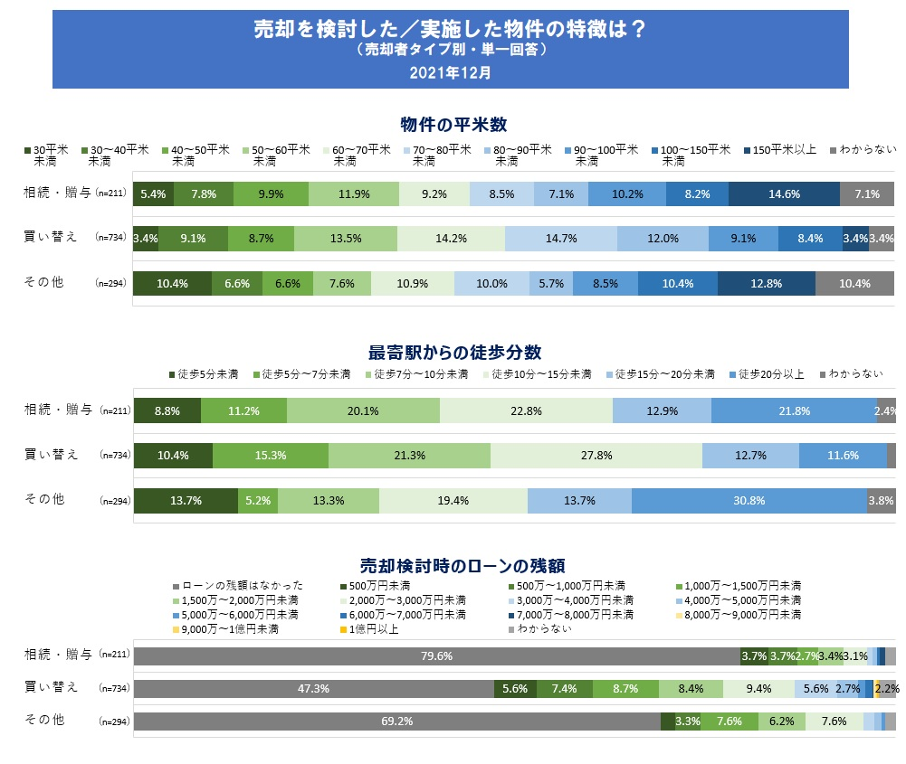 売却を検討する際、「相続・贈与」によって得た物件の場合を、「買い替え」のための売却物件の場合と比較したところ、相続物件は買い替えのための売却物件と比べて「古い」「広い」「駅から遠い」という傾向がわかりました。