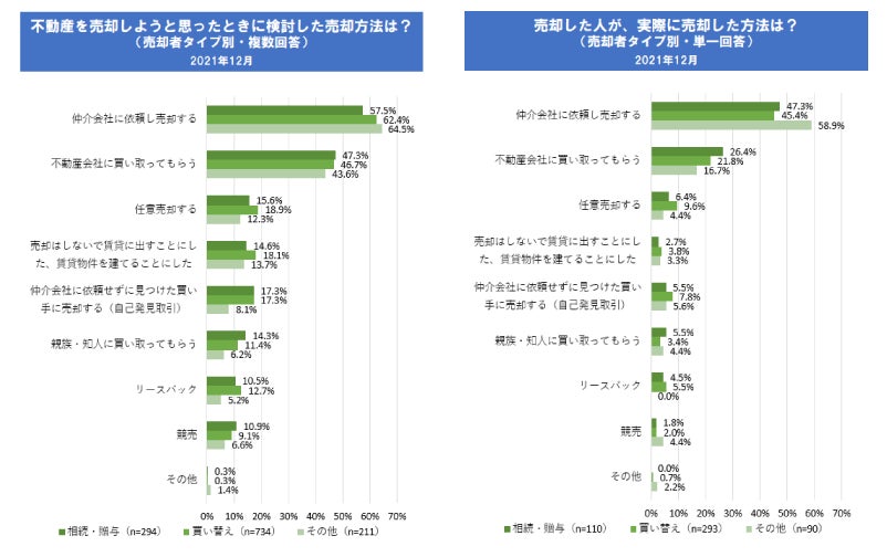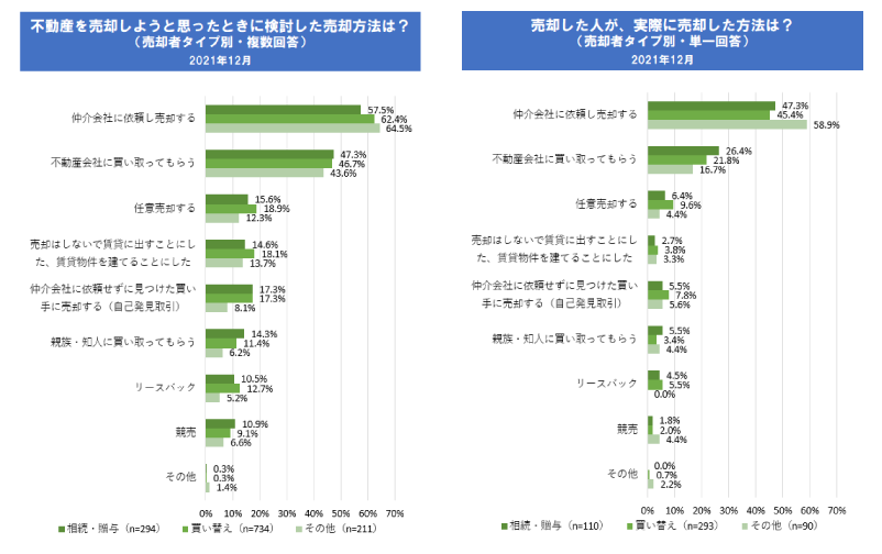 多くの人が仲介と買取を中心に複数の売却方法を検討し、最終的には仲介で売却していることがわかります。