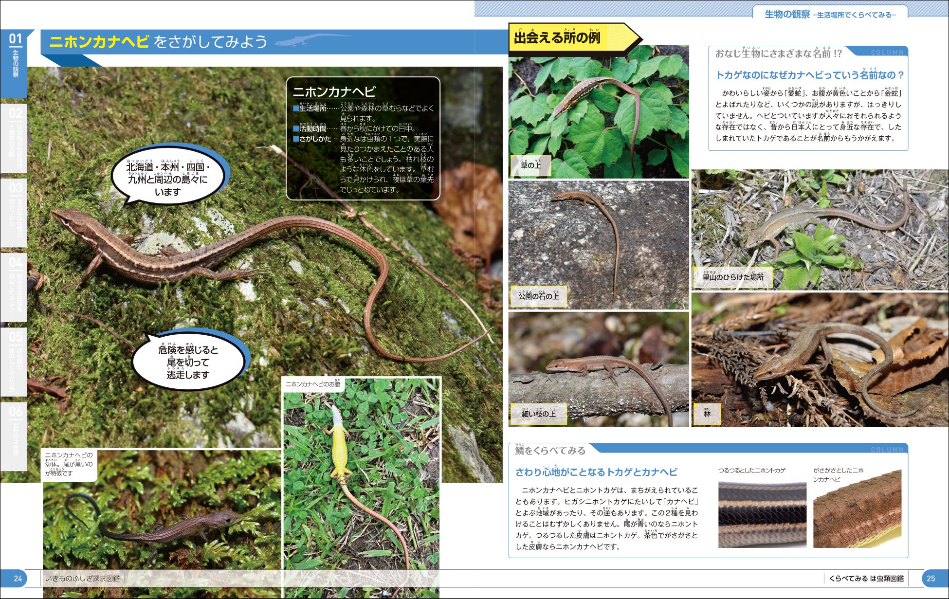 身近なは虫類として代表的なカナヘビ、ニホンイシガメ、シマヘビなどの行動パターンや探し方を紹介し、自然観察や飼育方法なども写真やイラストでわかりやすく解説します。