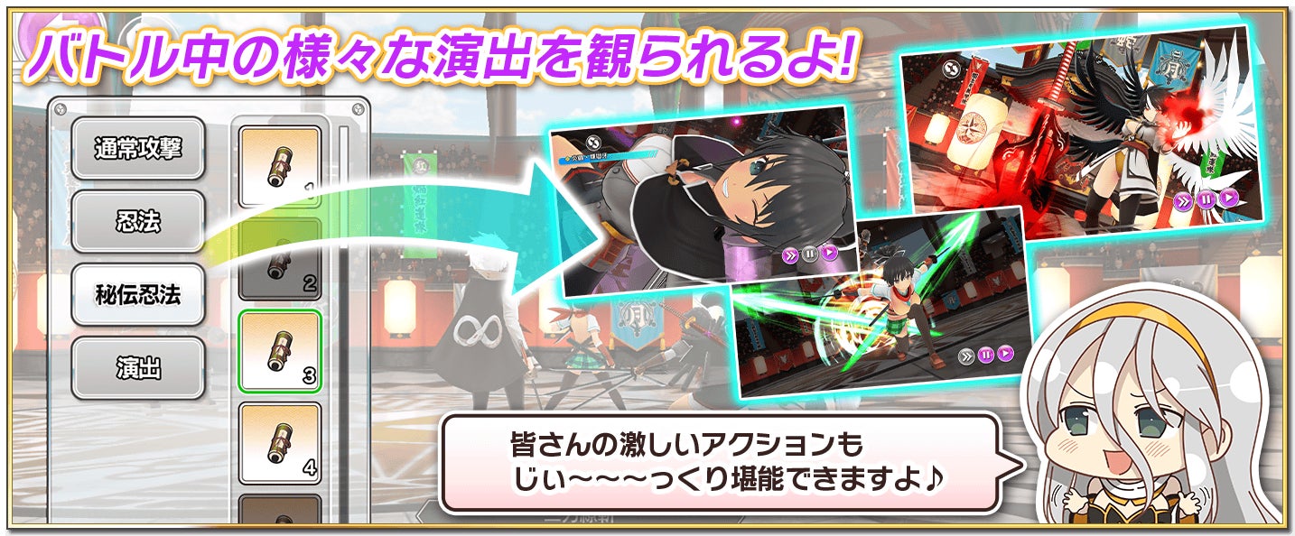「通常攻撃」「忍法」「秘伝忍法」「演出」のそれぞれの項目から、再生したい演出を選択し「再生」ボタンを押すことで、演出が始まります!