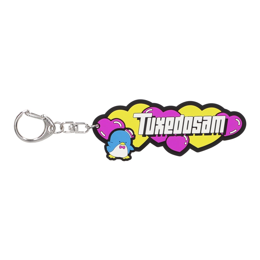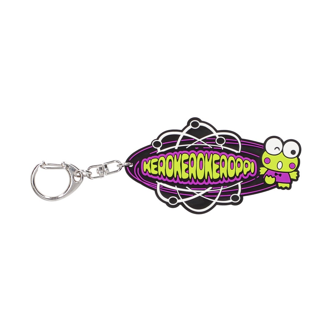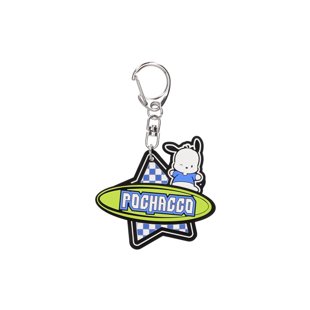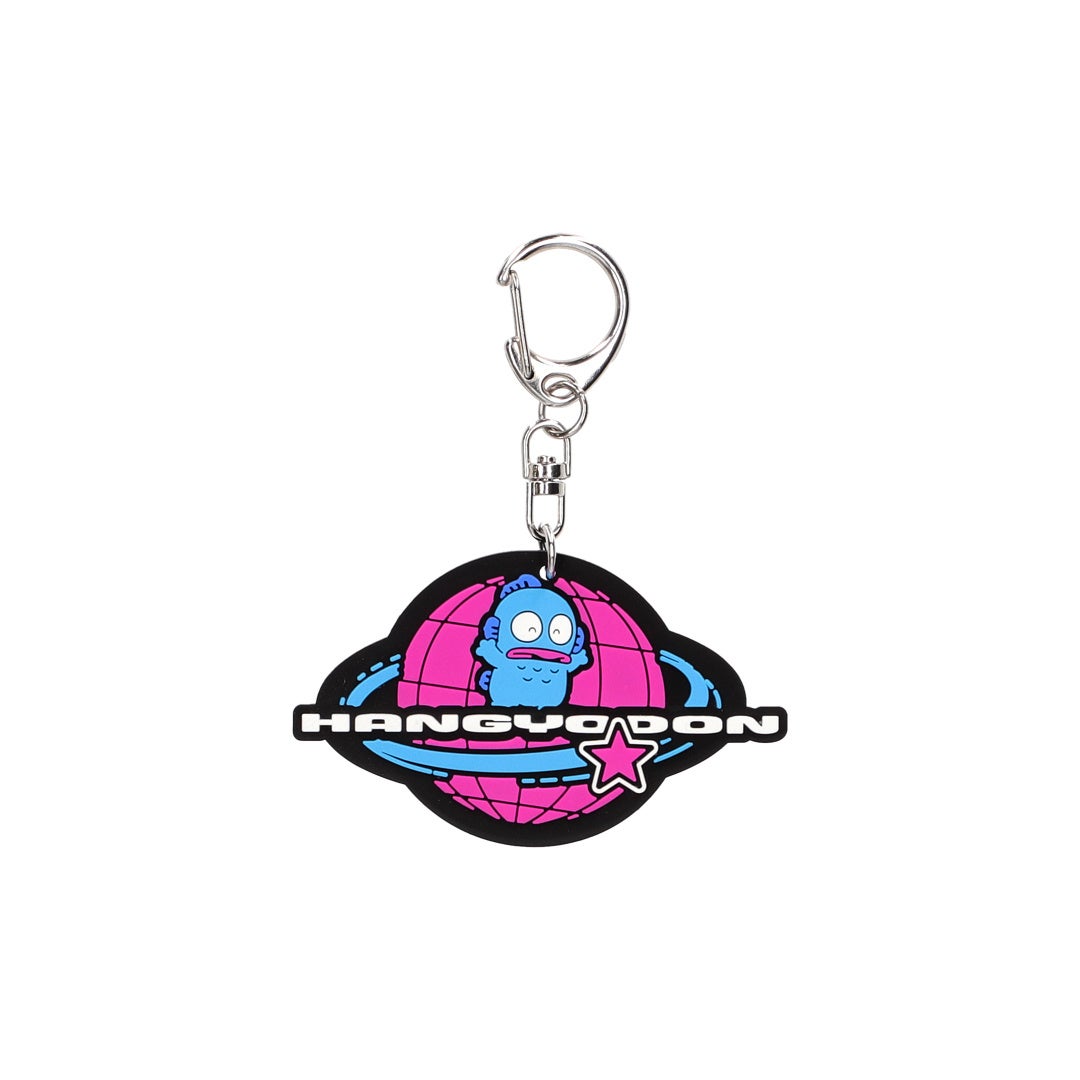 サンリオの人気6キャラクターユニット「はぴだんぶい」のキャラクターのポチャッコ、タキシードサム、けろけろけろっぴ、バッドばつ丸、ハンギョドン、あひるのペックルの名前を、ポップでレトロな雰囲気のフォントで表現したラバーキーホルダーです。2000年代に若者の間で流行したブランドのロゴをイメージしたデザインになっています。