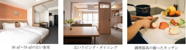『MIMARU大阪 心斎橋NORTH』は、心斎橋・長堀橋駅から徒歩圏内にありながら、居住者も多く、落ち着いた雰囲気のある南船場に位置する都市滞在型のアパートメントホテルです。全室キッチン、リビング・ダイニングつきで、ハリウッドベッドとバンクベッドを設けたファミリーアパートメントルーム(4名定員/6名定員)をはじめ、最大8名で一緒に食事を楽しめるファミリーシアターアパートメントルーム(8名定員)など全49室、36㎡~79㎡の客室で構成しています。1室1泊あたり26,800円~(4名利用時)、お得な連泊プランもご用意しています(※)。