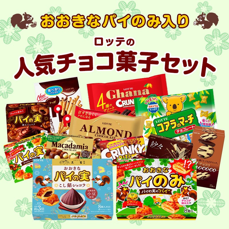 おおきなパイのみと一緒に、『京菓子司末富監修 おおきなパイの実<こし餡ショコラ>』『コアラのマーチ』『トッポ』『アーモンドチョコレート』などが入ったロッテの人気チョコ菓子12種12品のセットです。