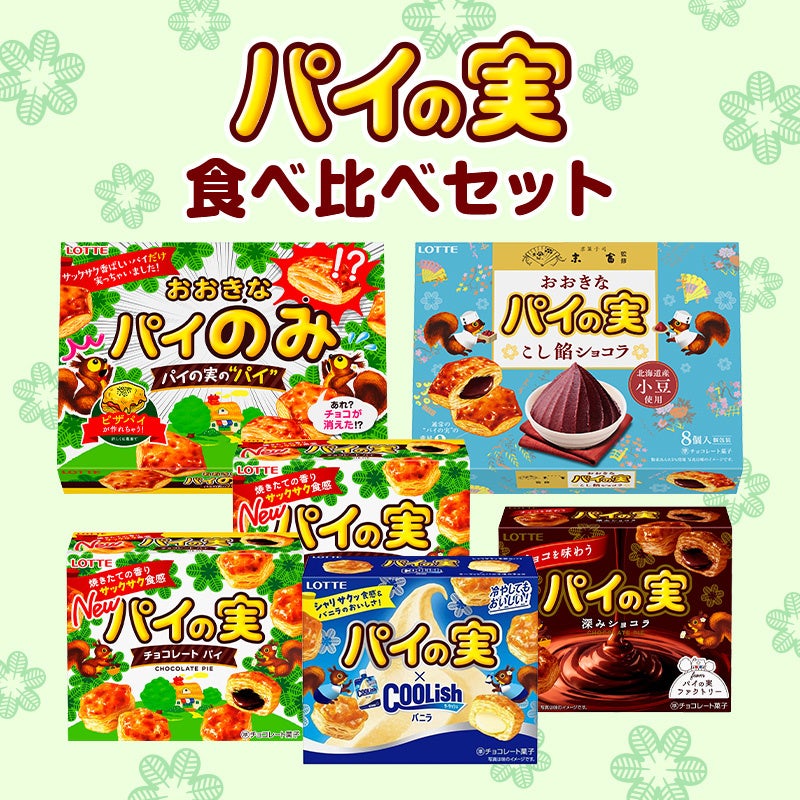 おおきなパイのみと一緒に、『京菓子司末富監修 おおきなパイの実<こし餡ショコラ>』、『チョコを味わうパイの実<深みショコラ>』や『パイの実<クーリッシュバニラ>』などが入ったパイの実5種6品のセットです。