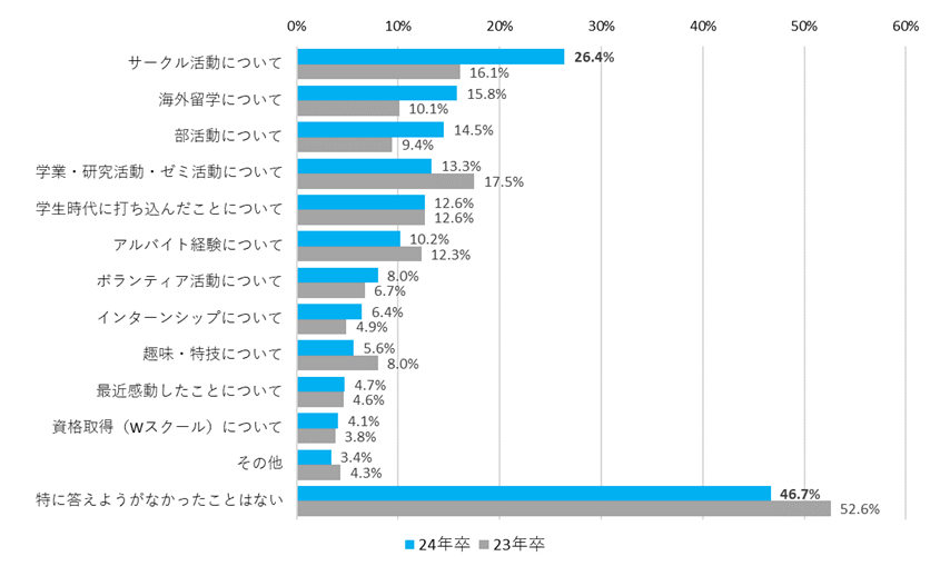 内々定を得ていない学生の現在の活動状況は、「第一志望群の面接を複数受けており、内々定が得られた企業から選ぶ予定」が最多で24.5%だった。未内々定の学生の多くは第一志望群の企業の選考に進んでいるようだが、一方で「就職活動を開始したばかりである」、「選考を受ける企業を選定している」など活動序盤の学生も多い。また別の設問で面接において、コロナ禍の影響で答えようがなかったことは「サークル活動について」(26.4%)が前年より10.3pt増加で最多となり、「特に答えようがなかったことはない」と答えた割合は減少した。2024年卒の学生は大学入学時にコロナ禍を迎え、サークルや部活動に参加する機会が減ったことが背景にあると考えられる※2。【図5、6】