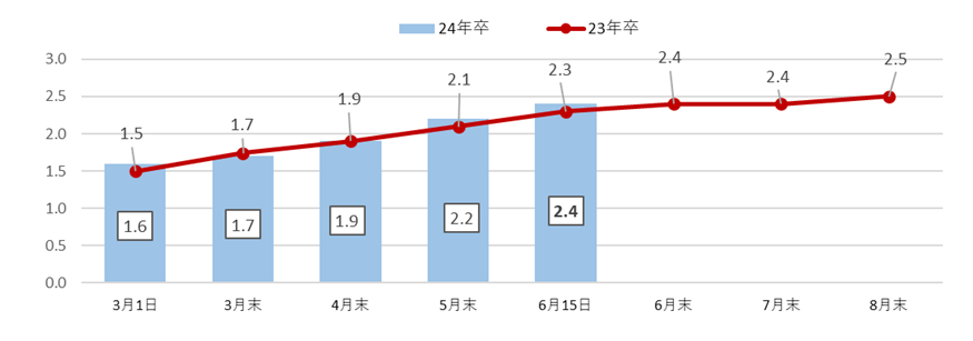 2024年卒業予定の大学生・大学院生の6月15日時点での内々定率は前年比2.3pt増の76.4%となり、平均内々定保有社数は前年比0.1社増の2.4社だった。5月末時点と同様、内々定率・平均内々定保有社数ともに高水準で推移している。【図1、2】