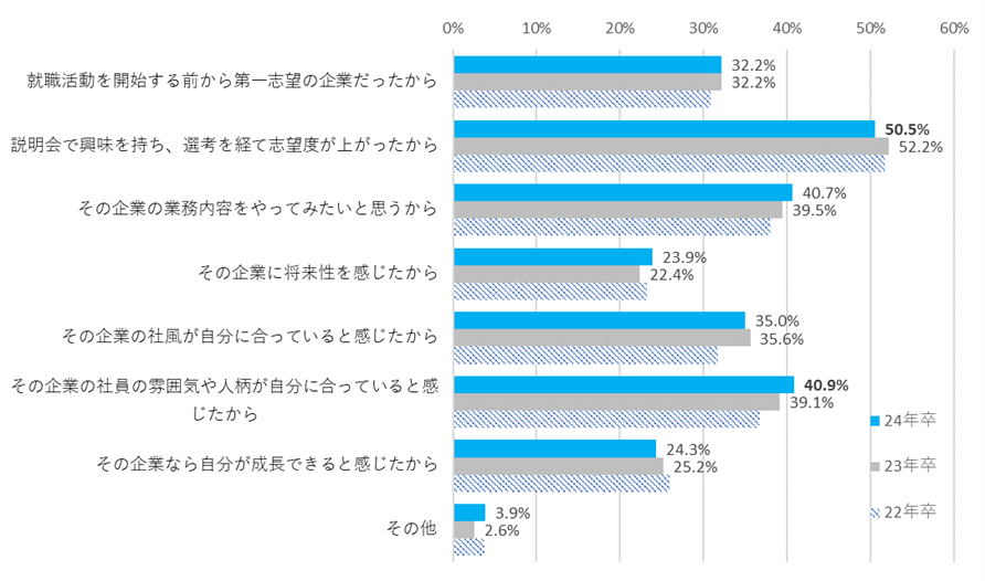 内々定を得た学生のうち、現時点で入社先企業を決定している学生は67.8%で、前年と同程度だった。入社先を決定した理由については、「説明会で興味を持ち、選考を経て志望度が上がったから(50.5%)」が最多で、前年から最も増加したのは「その企業の社員の雰囲気や人柄が自分に合っていると感じたから(40.9%)」で前年比1.8pt増となった。学生が企業を選択するポイントにおいても社風や社員の雰囲気を重視するが※1、入社予定先の決定に関しても同様の傾向が見られるようだ。【図3、4】