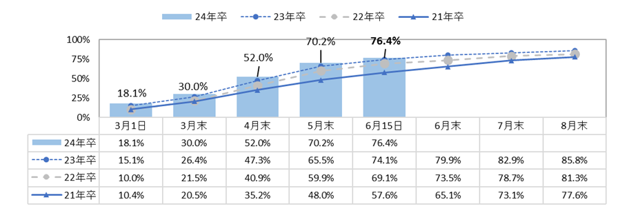 2024年卒業予定の大学生・大学院生の内々定率は76.4%で、前年比で2.3pt増加【図1、2】