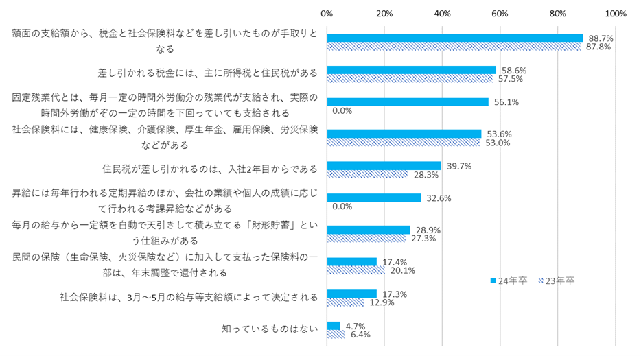 一般的な会社員の給与に関する知識で知っているものを選択してもらうと、最多は「額面の支給額から、税金と社会保険料などを差し引いたものが手取りとなる」(88.7%)で、次いで「差し引かれる税金には、主に所得税と住民税がある」(58.6%)、「固定残業代とは、毎月一定の時間外労働分の残業代が支給され、実際の時間外労働がその一定の時間を下回っていても支給される」(56.1%)など、額面と手取りや残業代に関する選択肢が上位に挙がった。一方、考課昇給や財形貯蓄、社会保険料については回答が少なかった。企業による初任給増額や賃上げの動き、社会保険料の引き上げなどが報道される中、入社後の昇給や資産形成、社会保険料の決定方法などに関しては、まだ学生の認知度が低いようだ。【図7】