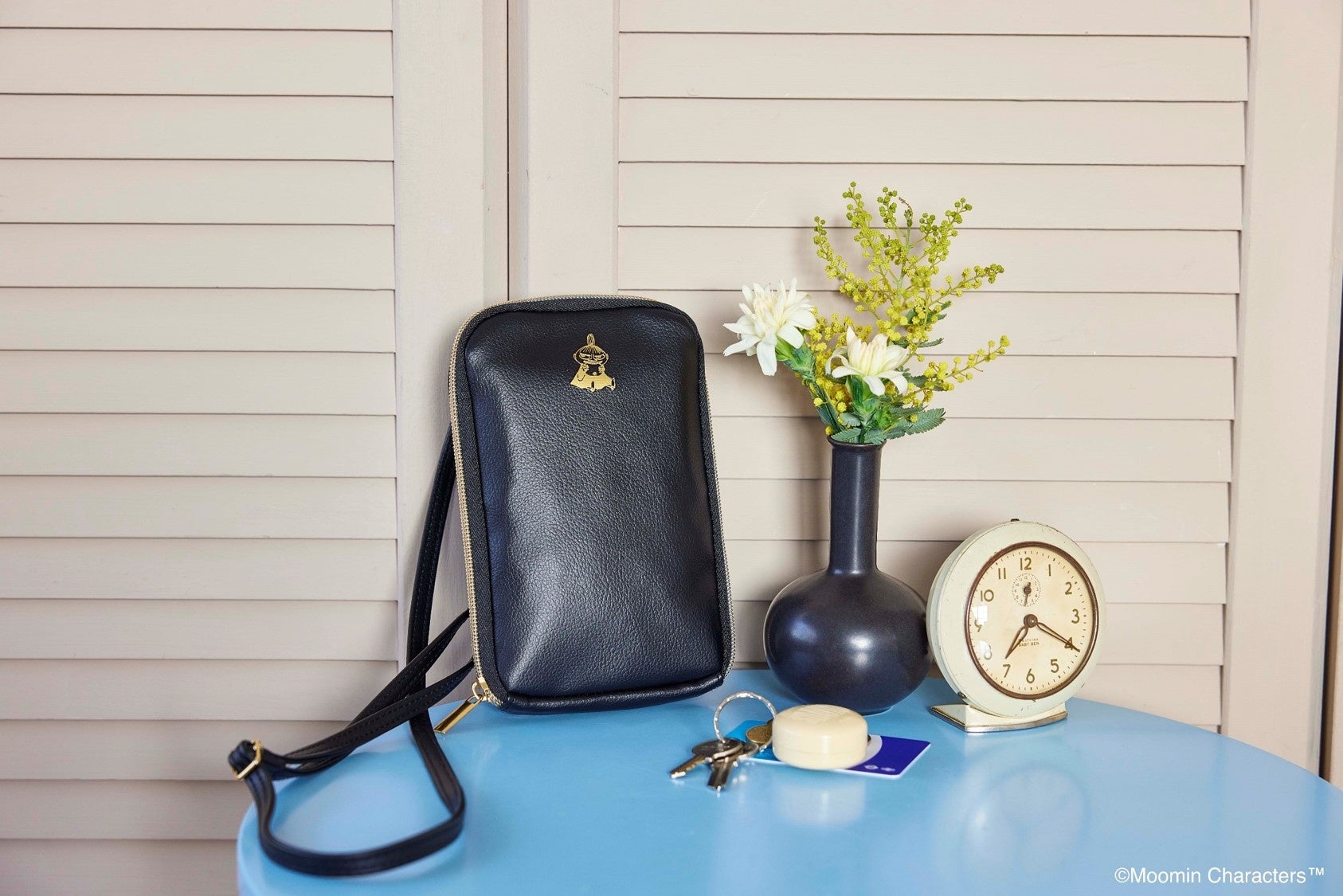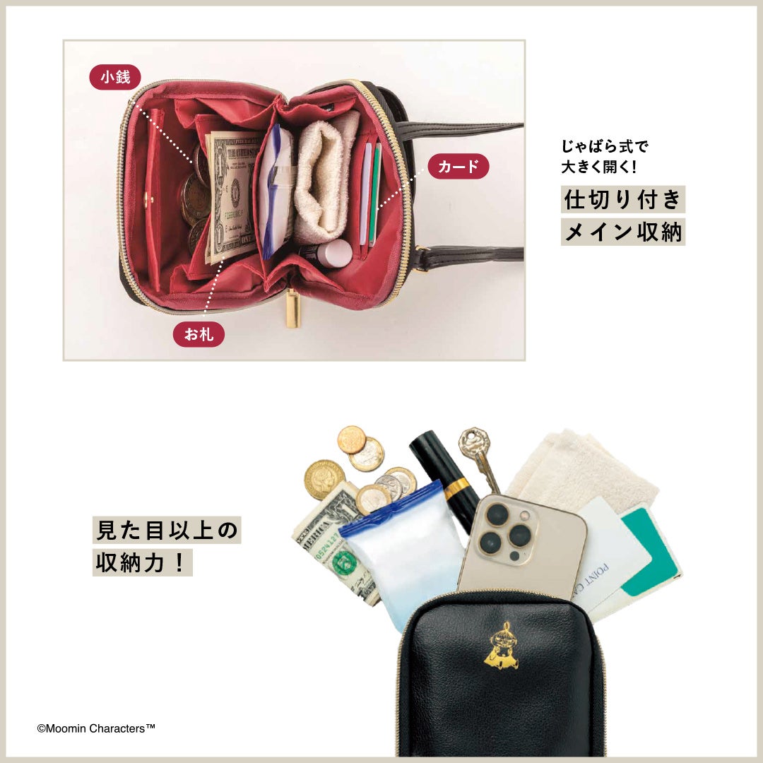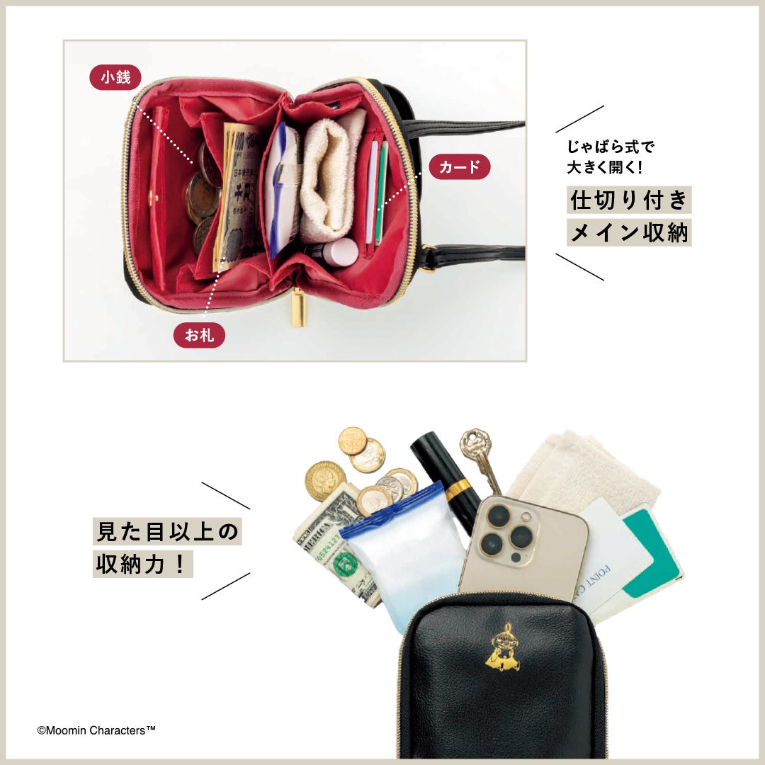 セブン-イレブン版は、コンパクトながら機能性に優れたスマホショルダー。メイン収納は仕切り付きで荷物を整理しやすく、ガバッと大きく開くじゃばら式。背面にスマホをサッと出し入れできるポケットが付いています。内側にはスナップボタン付きの小銭入れと2枚分のカードポケットもあり、お財布としての機能もバッチリ。コンパクトな見た目ながら、スマホをはじめお札、小銭、カード、鍵、リップ、ハンカチ、ティッシュなど外出に必要なものがしっかり入るので、これひとつでお出かけできます♪ こちらもブラックの生地に映えるゴールドのリトルミイの箔押しで、リッチな印象。大人に似合うレザー調の生地と、レッドの裏地が高級感のある上品なかわいさで、毎日のコーデに大活躍すること間違いなしです。