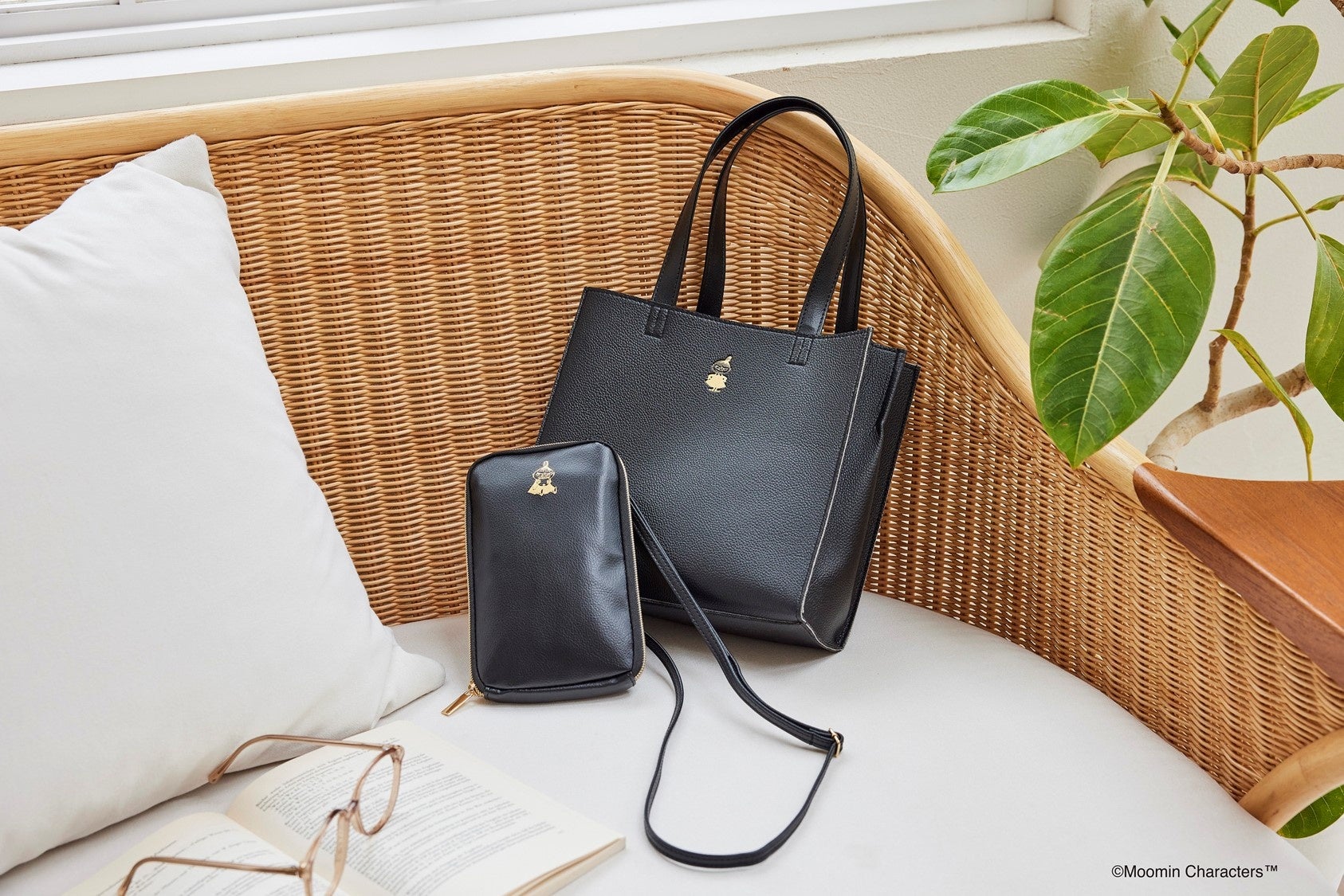 書店版は、見た目以上にたくさん入る仕切り付きのスクエアトートバッグ。バッグは中央に仕切りが付いているので、荷物がバッグのなかで散らかりにくく、整理されたきれいな状態を保てます。マチがたっぷりあるから、長財布や折りたたみ傘、メイクポーチなど、お出かけの必需品がすっぽり。500mLのペットボトルも縦に入れられます。 デザインは、シックなブラックのレザー調にゴールドの箔押しで高級感たっぷり。箔押しのリトルミイが大人かわいいアクセントになっています。持つだけでおしゃれ度がぐっと上がる、大人が持ちたい上品でリッチなバッグに仕上がりました。