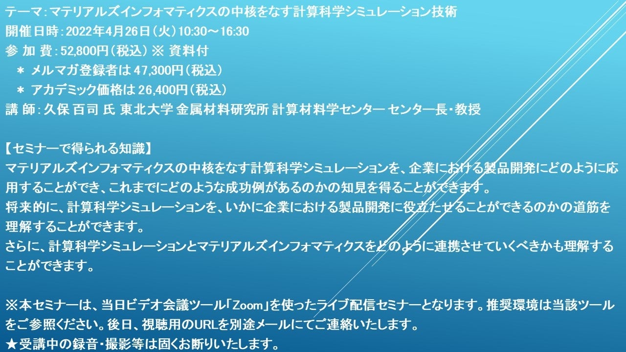先端技術情報や市場情報を提供している(株)シーエムシー・リサーチ(千代田区神田錦町: https://cmcre.com/ )では、 各種材料・化学品などの市場動向・技術動向のセミナーや書籍発行を行っておりますが、 このたび「マテリアルズインフォマティクスの中核をなす計算科学シミュレーション技術」と題するセミナーを、 講師に久保 百司 氏 東北大学 金属材料研究所 計算材料学センター センター長・教授)をお迎えし、2022年4月26日(火)10:30より、 ZOOMを利用したライブ配信で開催いたします。 受講料は、 一般:52,800円(税込)、 弊社メルマガ会員:47,300円(税込)、 アカデミック価格は26,400円(税込)となっております(資料付)。