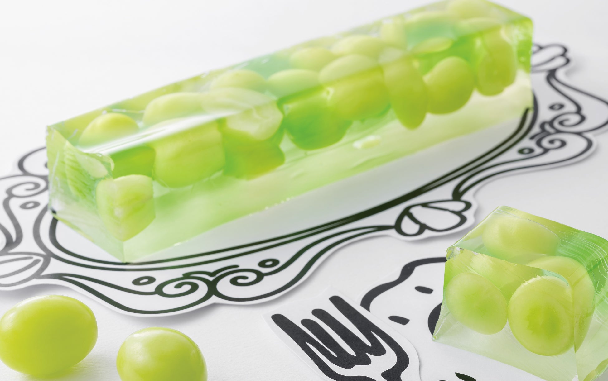 シャインマスカットの2Dシフォンケーキ / シャインマスカットのムースタルト / シャインマスカットのショートケーキ / シャインマスカットのゼリーテリーヌ / シャインマスカットのヴェリーヌ / 長野県産シャインマスカットのゼリー / マスカットくずもち / 洋ナシと青葡萄のケーキ / モノクロムース / ルリジューズ など