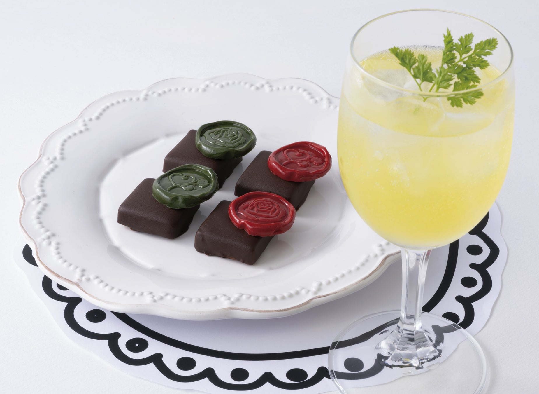 表面を絵のように縁取った見た目がキュートな「シャインマスカットの2Dシフォンケーキ」は、シャインマスカットジャムを練り込んだ生地をシャインマスカットのバタークリームでコーティングした、まさにシャインマスカット尽くしなスイーツ。艶やかな大粒のシャインマスカットをあしらった「シャインマスカットのムースタルト」は、まろやかなフロマージュブランのムースがシャインマスカットのジューシーな甘みをより際立たせる秋にぴったりなフルーツタルトです。また、秋のスイーツビュッフェの幕開けにふさわしい「Cadeaux de Mascate ~マスカットからの贈り物~」は、マスカットの風味と弾ける炭酸が爽やかなウエルカムドリンク。パリ気分をさらに高める封蝋印を押したウエルカムチョコレート「封蝋ショコラ」もご提供します。