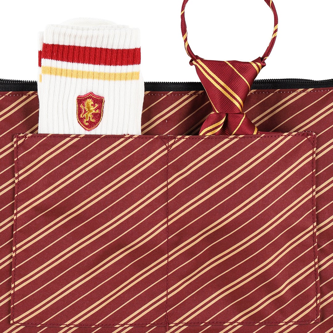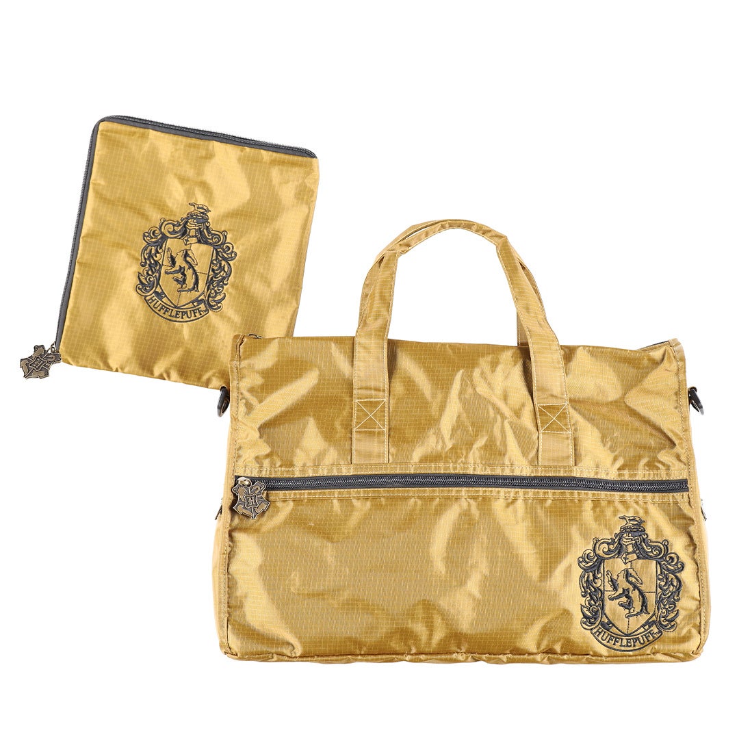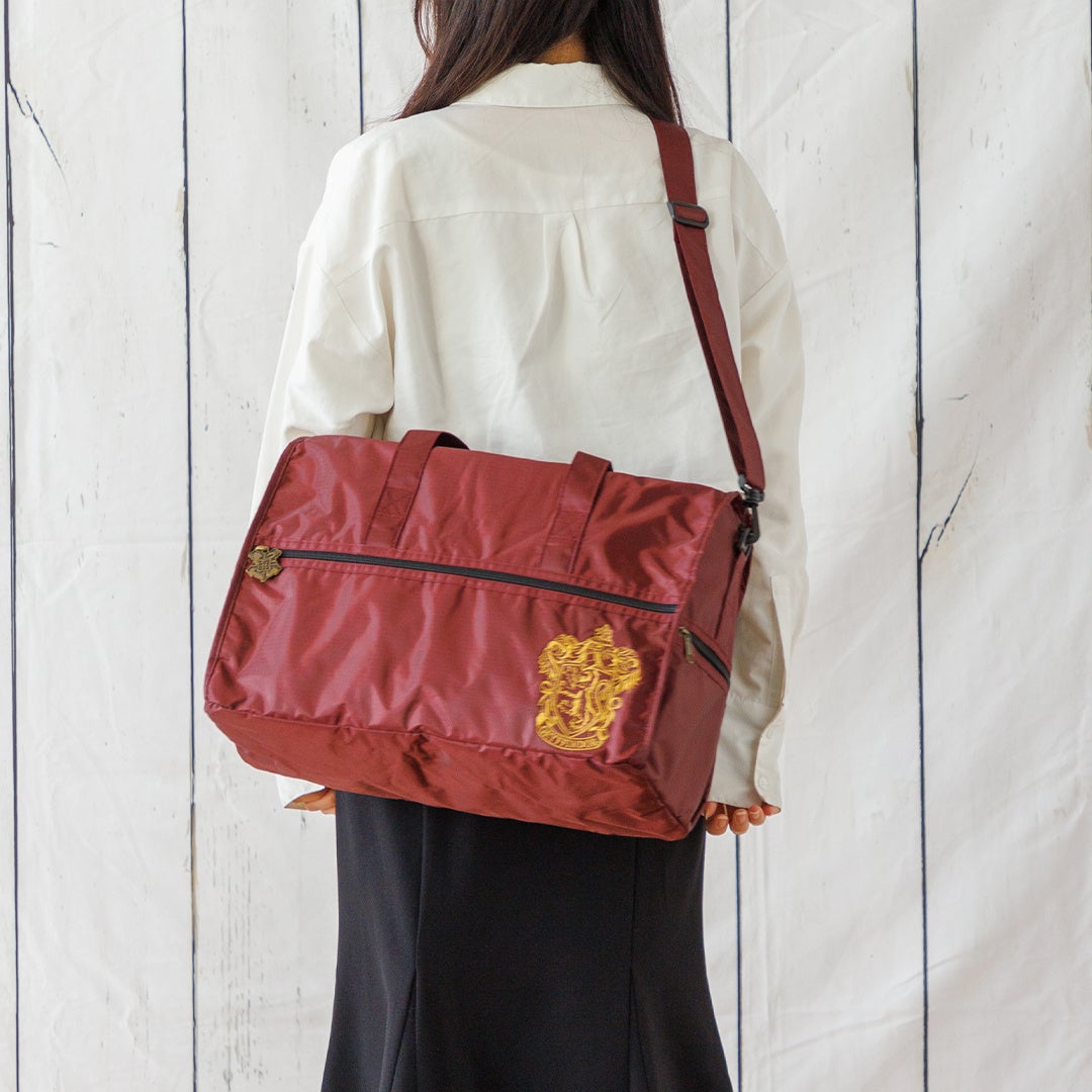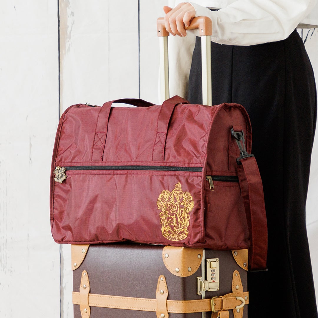 付属のポーチに折りたたんでコンパクトに収納できるボストンバッグです。ポーチは単品でも使用することができます。ホグワーツ魔法魔術学校の各寮のシンボルカラーの生地に寮のエンブレムの刺繍をほどこしました。内生地はホグワーツ生のマフラーをイメージしたデザインになっていて、表側と内側で異なる柄を楽しめます。内ポケットや付属のショルダーストラップ、キャリーバー通しなど、機能性にもこだわっており、旅行先でのお土産用バッグやエコバッグ、サブバッグなど、おでかけから普段使いまで幅広く活躍するアイテムです。