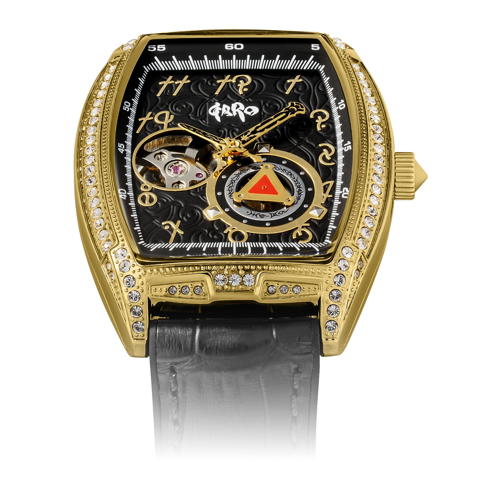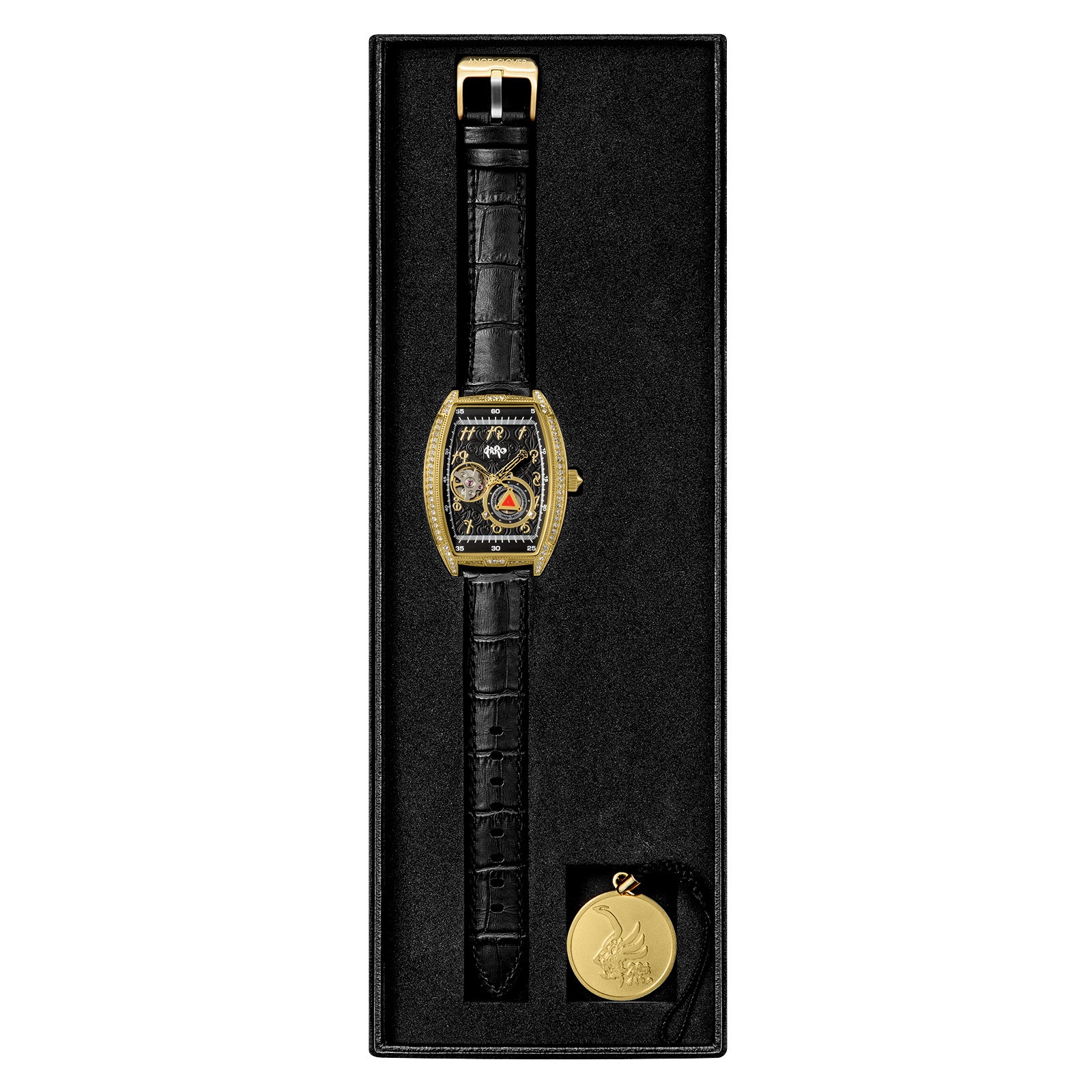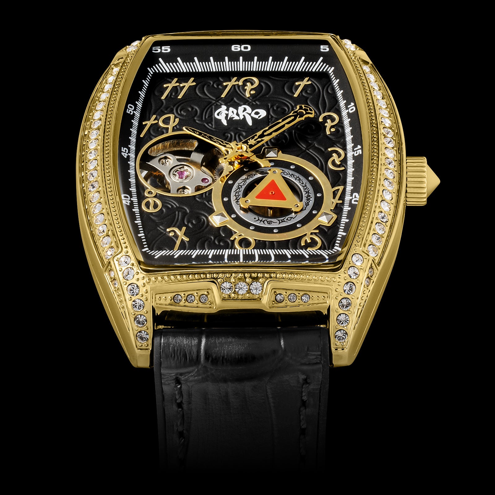 直線と曲線が交錯するトノー型のフォルムにより、鎧を思わせる重厚な造形と、騎士としての美しさを両立。ゴールドカラーのケースが放つ存在感は、一目で牙狼とわかる圧倒的な力強さを腕元に刻み込みます。日常使いとしてはもちろん、限定350本という希少価値の高い1本だけに、ぜひこの機会をお見逃しなく。