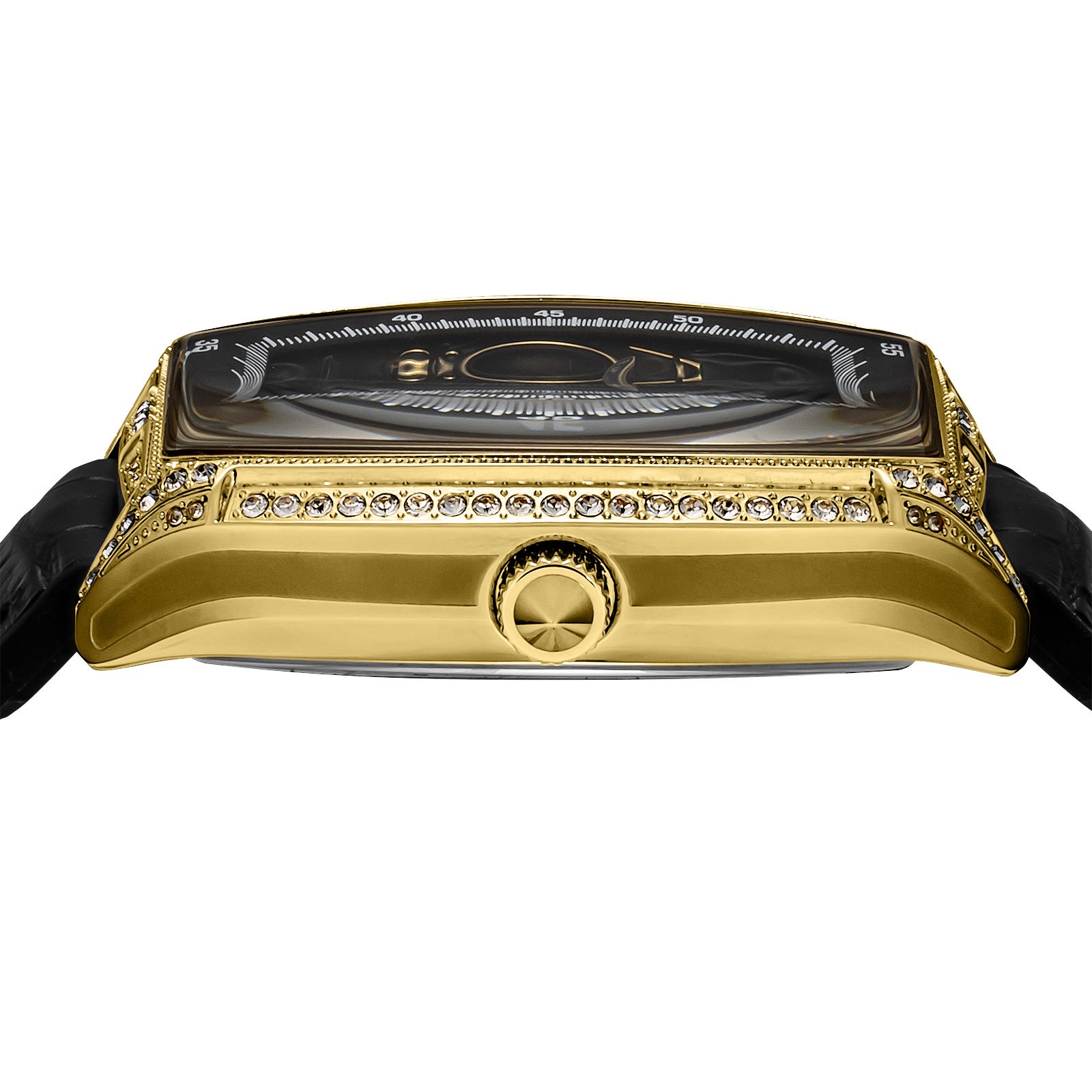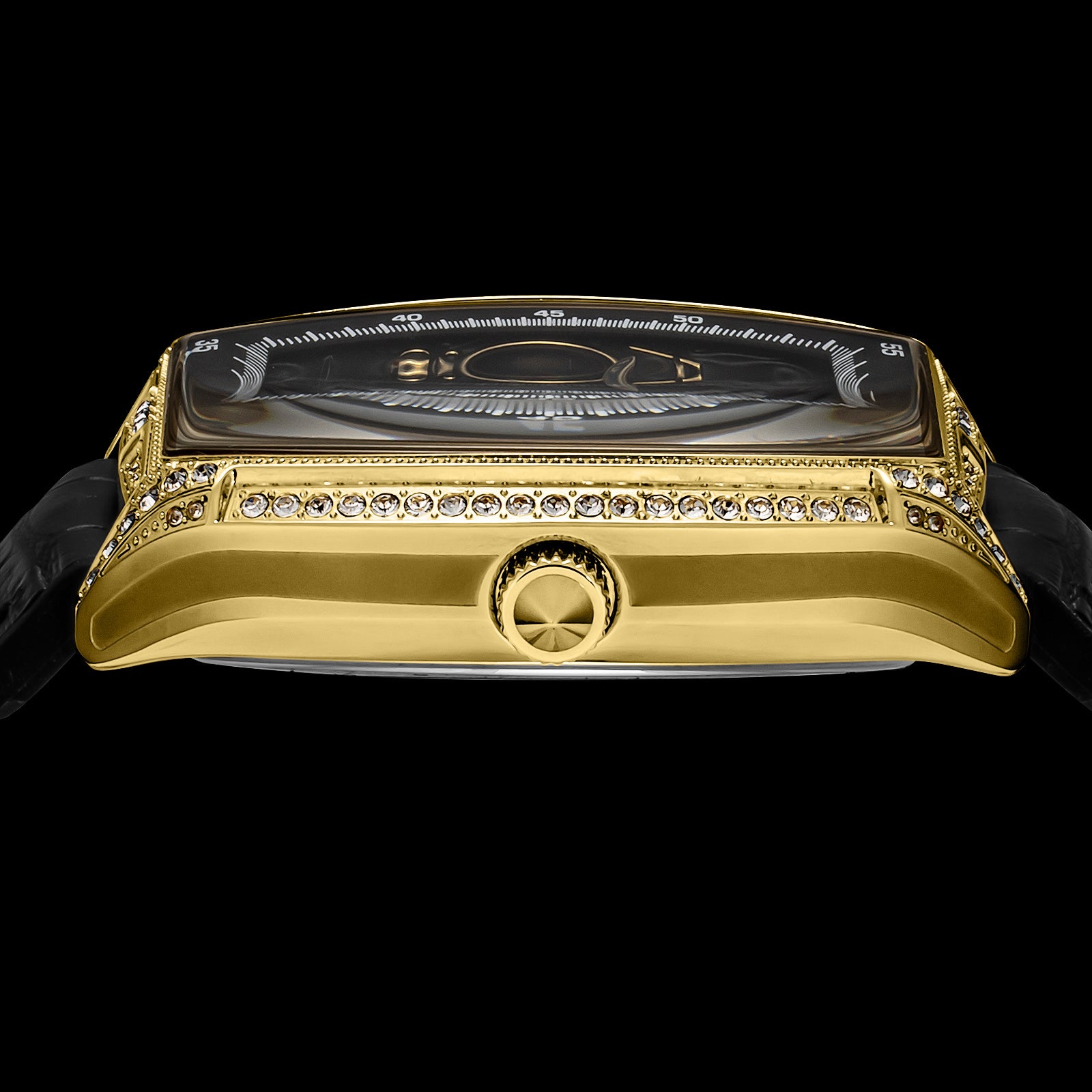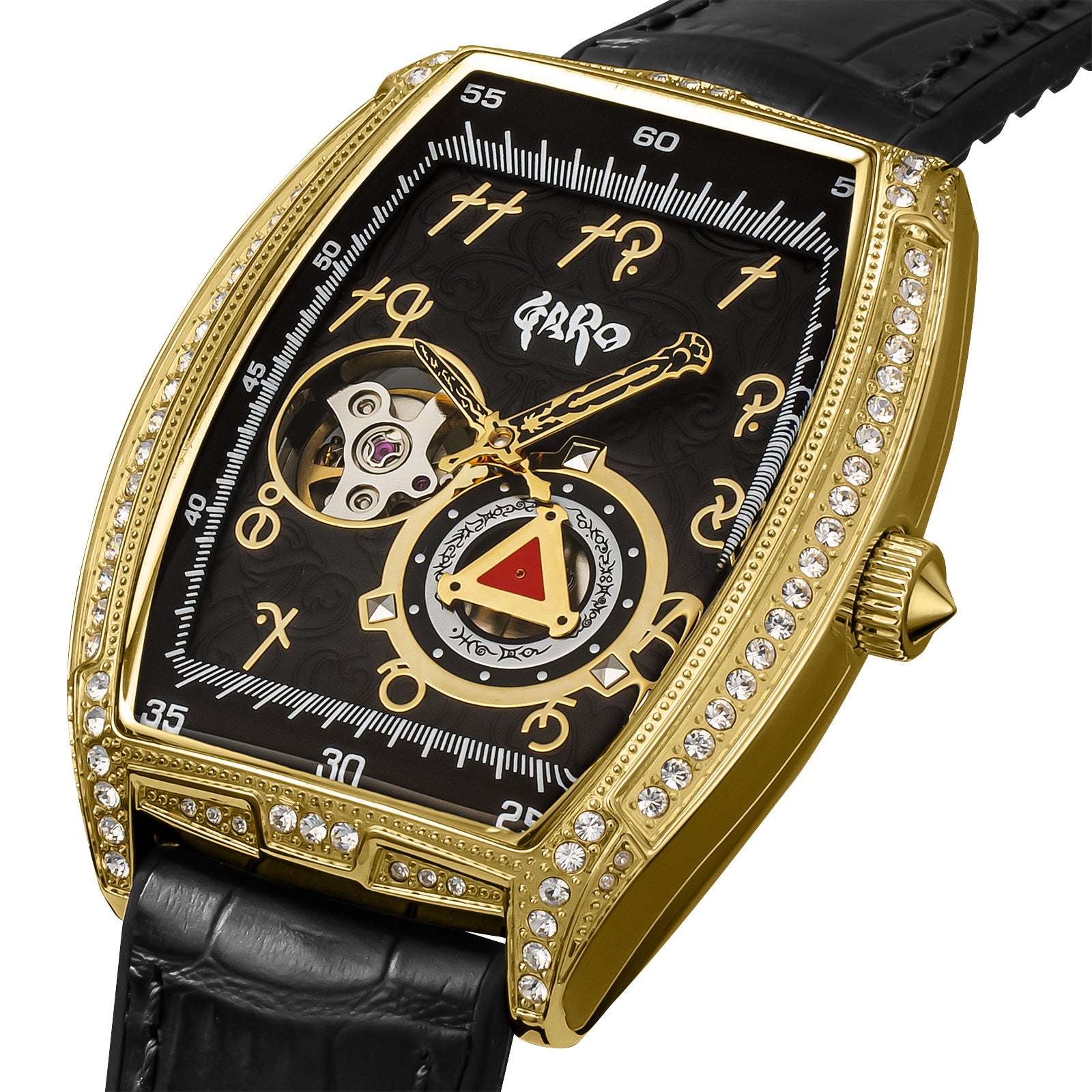直線と曲線が交錯するトノー型のフォルムにより、鎧を思わせる重厚な造形と、騎士としての美しさを両立。ゴールドカラーのケースが放つ存在感は、一目で牙狼とわかる圧倒的な力強さを腕元に刻み込みます。日常使いとしてはもちろん、限定350本という希少価値の高い1本だけに、ぜひこの機会をお見逃しなく。