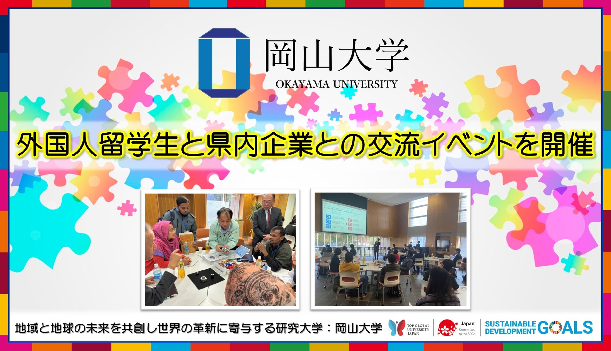 国立大学法人岡山大学(本部:岡山市北区、学長:那須保友)は、2023年11月1日、岡山大学研究協力会との連携により、岡山大学に在学中の外国人留学生と県内企業との交流イベントを本学津島キャンパスで開催しました。