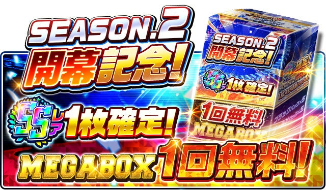 期間中にログインするだけで、SSレア選手が1枚確定で獲得できる「SEASON.2 開幕記念!SSレア1枚確定!1回無料!MEGA BOX」が手に入ります。カード3枚入りパックが10パックと、SSレア確定の1枚入りパックが1パック、合計31枚のカードが獲得できます。