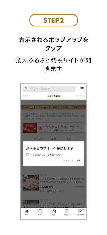 2.表示されるポップアップをタップし、「楽天ふるさと納税」サイトへ移動する