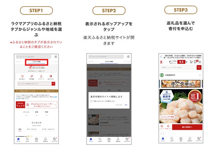 「楽天ふるさと納税」は「楽天市場」内のサービスのため、Step2で「楽天市場」サイトへ移動した以降は、寄付申し込みや決済は「楽天ラクマ」ではなく「楽天市場」内で完結されます。