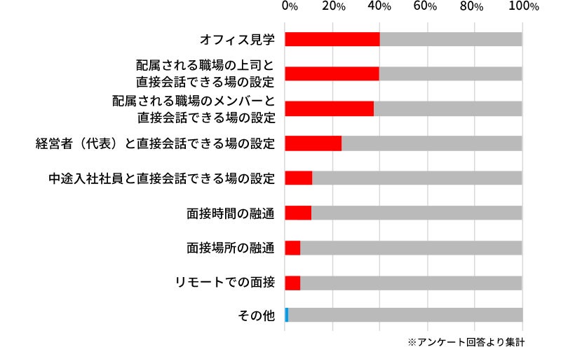 ✓選考での要望は、「オフィス見学」「配属される職場の上司と直接会話できる場の設定」「配属される職場のメンバーと直接会話できる場の設定」など職場環境が分かる機会の設定が上位となった。