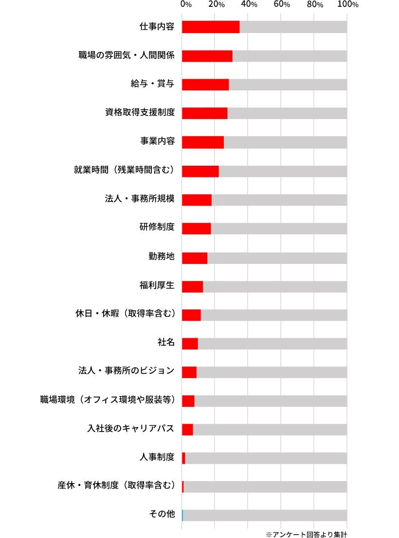 全体で最も回答が多かったのは「仕事内容」で、次いで「職場の雰囲気・人間関係」「給与・賞与」「資格取得支援制度」となった。世代別で最も多かった回答は、学生:「資格取得支援制度」、20代以下(学生除く)・30代・40代以上:「仕事内容」であった。