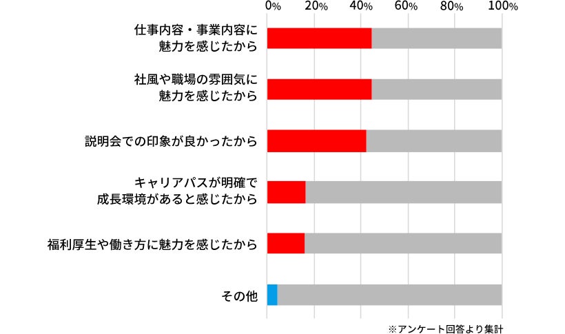 回答傾向から、参加者にとって身近な要素(就業する際の業務内容や雰囲気など)が印象に大きく影響していることが伺える。世代別で最も多かった回答は、学生:「説明会での印象が良かったから」、20代以下(学生除く):「社風や職場の雰囲気に魅力を感じたから」、30代:「仕事内容・事業内容に魅力を感じたから」「説明会での印象が良かったから」、40代以上:「仕事内容・事業内容に魅力を感じたから」となった。