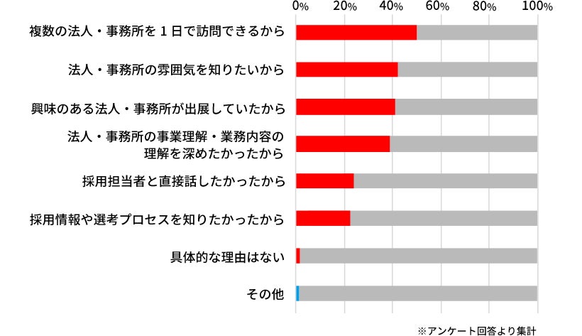 ✓就職説明会への参加理由から、参加者は様々な法人・事務所について多角的に理解を深める機会として参加していることが伺える。