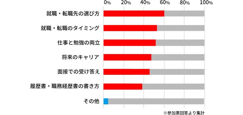 全体で回答が多かったのは「就職・転職先の選び方」である。世代別で最も多かった回答は、学生・40代以上:「就職・転職先の選び方」、20代以下(学生除く):「就職・転職のタイミング」、30代:「就職・転職先の選び方」「将来のキャリア」となった。