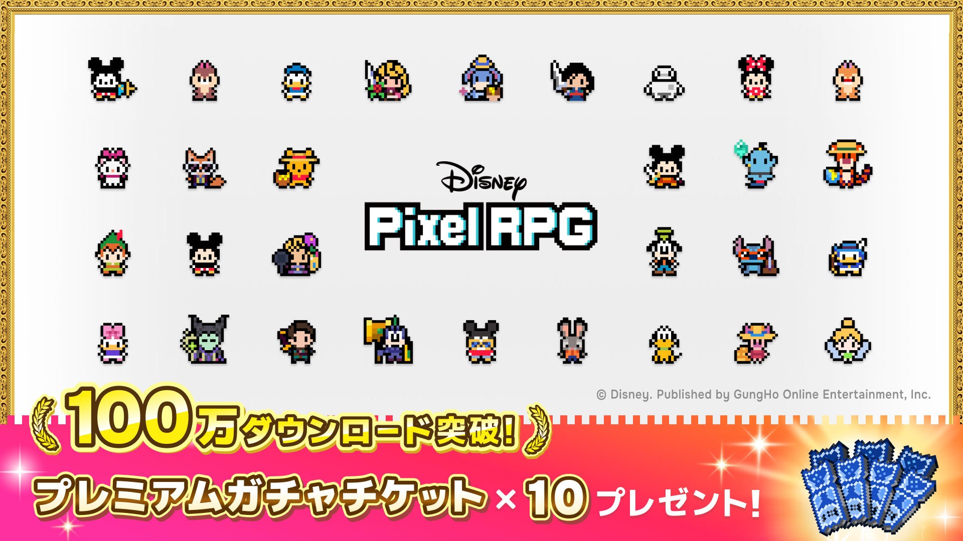 『ディズニー ピクセルRPG』はすでに多くの方にご愛顧いただき、サービス開始より7日間で世界累計100万ダウンロードを突破いたしました。プレイヤーの皆様に感謝の気持ちを込めて、ゲーム内メールにて「プレミアムガチャチケット×10」をプレゼントいたします。まだプレイしたことのない方も、この機会にぜひディズニーのキャラクターたちと一緒に冒険へでかけましょう。