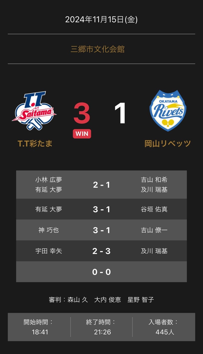 ノジマTリーグ 2024-2025シーズン 公式戦 11月15日開催 「T.T彩たま vs 岡山リベッツ」の試合は、3-1でT.T彩たまが勝利しました。