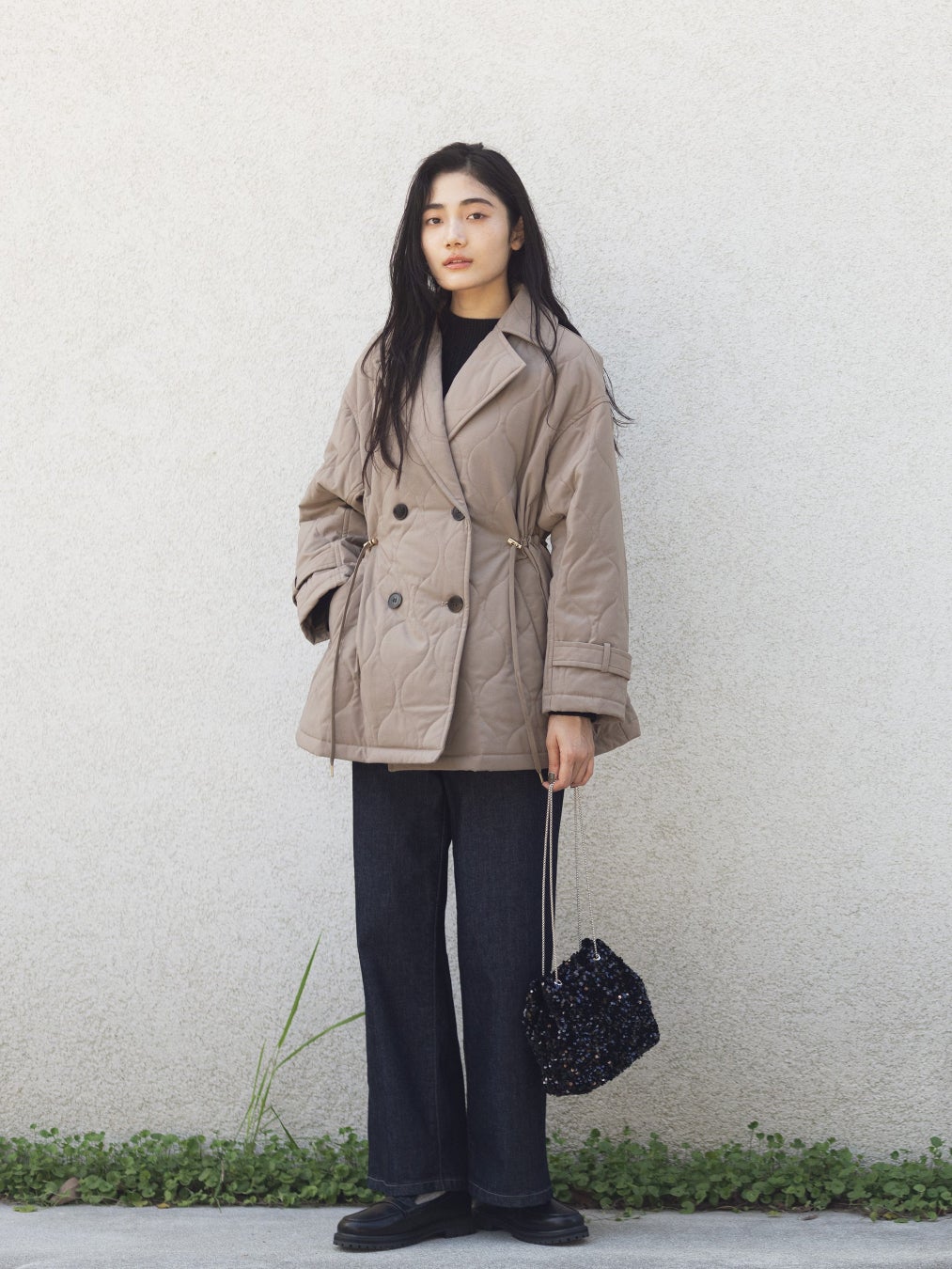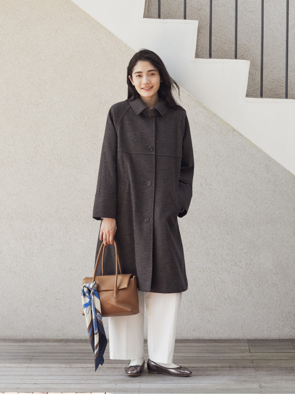 コート¥12,097/カーディガン¥7,147/パンツ¥5,497/バッグ¥4,177/シューズ¥6,047/ピアス¥1,757