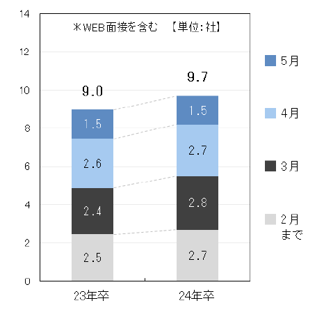 5月までに採用面接を受けた社数の累計平均は9.7社(前年同月比0.7pt増)、そのうちWEB面接は7.8社(前年同月比0.2pt増)でほぼ前年並みだった。また、5月に受けた面接がWEB面接だった割合は59.3%(前月比13.4pt減、前年同月比11.9pt減)、対面の面接だった割合は40.7%(前月比13.4pt増、前年同月比11.9pt増)だった。コロナ禍で広く普及したWEB面接は現在も対面より実施割合が高く、新卒採用活動の中で定着したと言えるだろう。【図2、3、4】