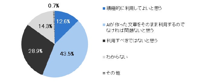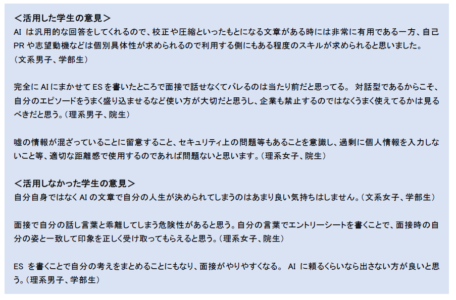 エントリーシート作成のためにChatGPTなどの対話型AIを利用したことがある学生の割合は9.7%だった。実際の活用例では「自分で書いた文章を添削・校正してもらう」というコメントのほか、「AIにひな形となる文章を書いてもらって実際のエピソードなどを追加する」という学生もいた。エントリーシート作成のために対話型AIを利用することについてどう思うかは、「AIが作った文章をそのまま利用するのでなければ問題ないと思う」学生が43.5%だった。実際に利用した学生からは、「事実確認など十分注意を払って、工夫しながら利用する必要がある」といったコメントが挙がり、対話型AIは何が得意なのかを理解している印象だ。一方、利用しなかった学生からは「エントリーシートは自分の言葉で書くべき」という意見が挙がった。【図5、6、7、8】