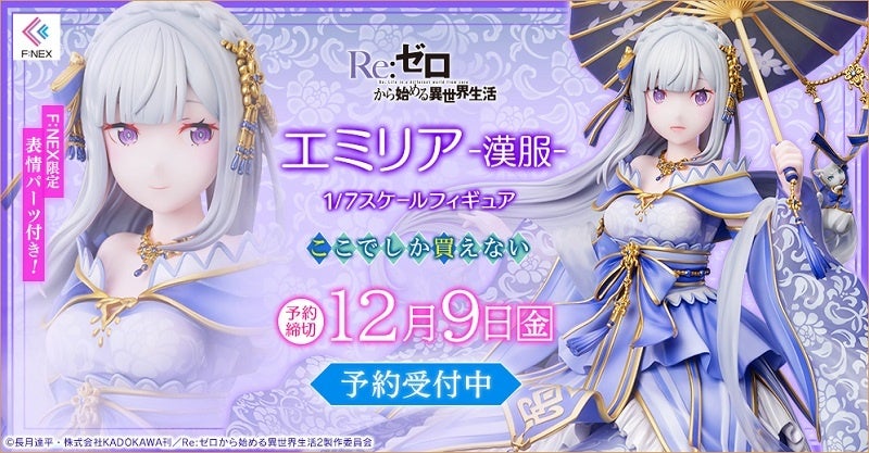 フリュー株式会社(本社:東京都渋谷区、代表取締役社長:三嶋隆、以下フリュー)は、高品質ホビーブランド「F:NEX(フェネクス)」の新商品として、TVアニメ「Re:ゼロから始める異世界生活」より『エミリア -漢服- 1/7スケールフィギュア』の発売を決定いたしました。本日10月1日(土)より、フリューが運営するホビーECサイト『F:NEX』(URL:https://fnex.jp/)にて予約が可能となります。