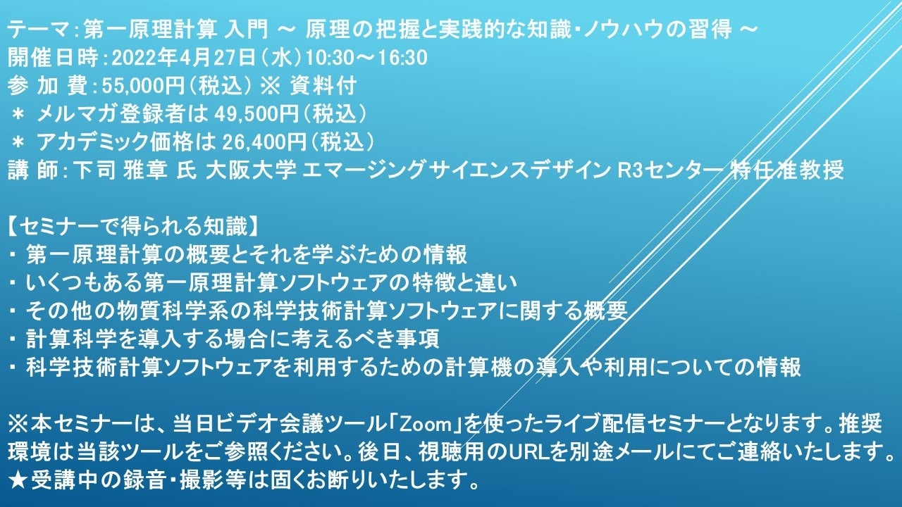 先端技術情報や市場情報を提供している(株)シーエムシー・リサーチ(千代田区神田錦町: https://cmcre.com/ )では、 各種材料・化学品などの市場動向・技術動向のセミナーや書籍発行を行っておりますが、 このたび「第一原理計算 入門 ~ 原理の把握と実践的な知識・ノウハウの習得 ~」と題するセミナーを、 講師に下司 雅章 氏 大阪大学 エマージングサイエンスデザイン R3センター 特任准教授)をお迎えし、2022年4月27日(水)10:30より、 ZOOMを利用したライブ配信で開催いたします。 受講料は、 一般:55,000円(税込)、 弊社メルマガ会員:49,500円(税込)、 アカデミック価格は26,400円(税込)となっております(資料付)。