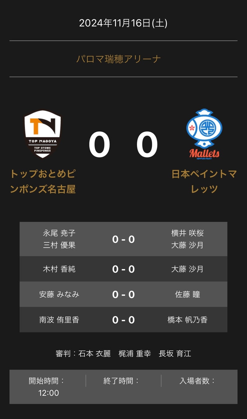ノジマTリーグ 2024-2025シーズン 公式戦 11月16日開催 トップおとめピンポンズ名古屋 vs 日本ペイントマレッツ 対戦オーダー発表