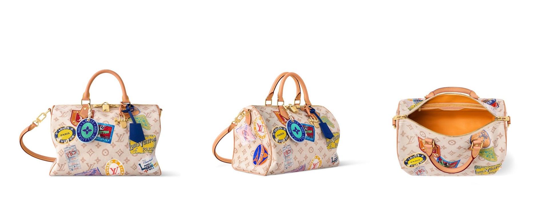 「スピーディ·バンドリエール 30 ソフト」は、飛行機のチャームと、ガストン-ルイ·ヴィトンのオリジナル·コレクションから受け継いだ遊び心溢れるパッチワーク風のラベルをあしらった、旅に最適なアイテムです。より長めのハンドルを取付けてショルダーバッグとしても楽しめます。