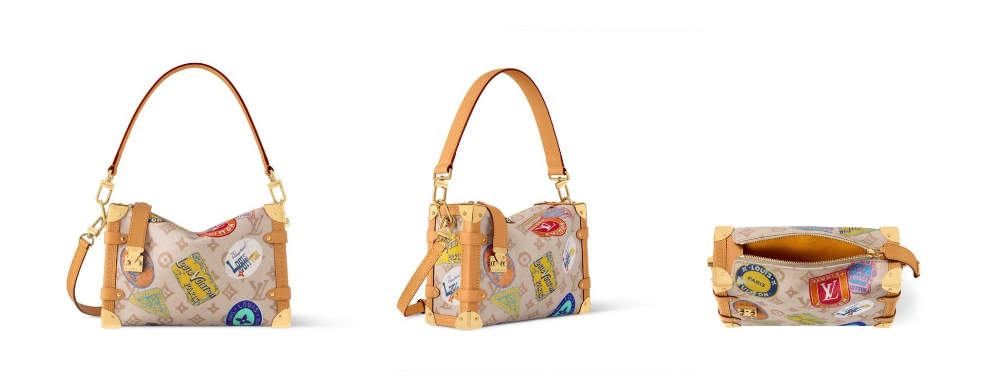 「サイドトランク MM」は、パッチワークを想わせるプレイフルなラベルがあしらわれた軽量なデザインを、飛行機のチャームをはじめとするゴールドカラーの金具とシグネチャーのキーベルで引き立てました。アイコニックなヌメ革のトリミングがメゾンのトランク製造の伝統を讃えます。