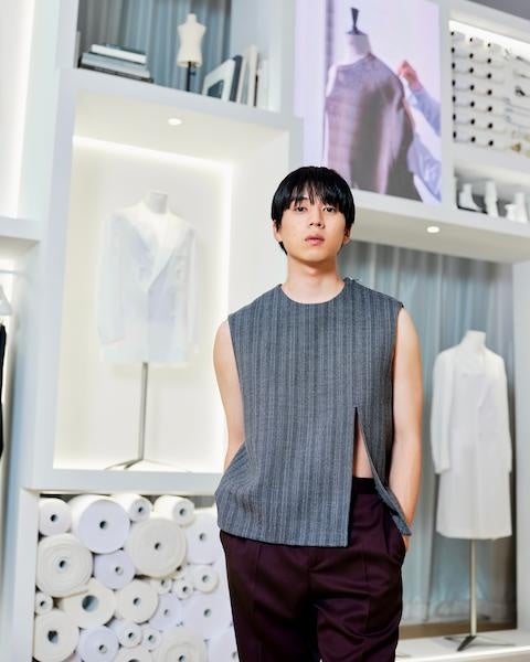 坂東龍汰は、2024年ウィンター メンズ コレクションからグレーの「パフ」ウエストコートにバーガンディのパンツを纏い、ブラックのダービーシューズとシルバーの「レターズ」リングを合わせました。