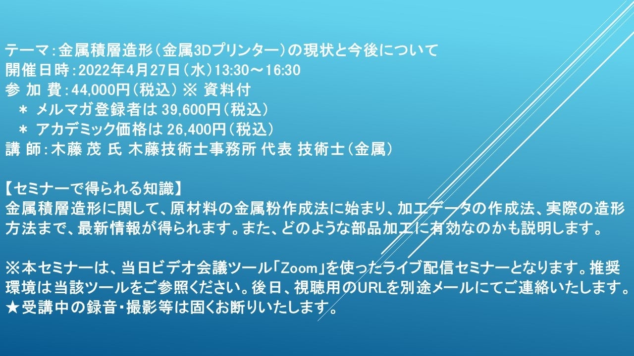 先端技術情報や市場情報を提供している(株)シーエムシー・リサーチ(千代田区神田錦町: https://cmcre.com/ )では、 各種材料・化学品などの市場動向・技術動向のセミナーや書籍発行を行っておりますが、 このたび「金属積層造形(金属3Dプリンター)の現状と今後について」と題するセミナーを、 講師に木藤 茂 氏 木藤技術士事務所 代表 技術士(金属))をお迎えし、2022年4月27日(水)13:30より、 ZOOMを利用したライブ配信で開催いたします。 受講料は、 一般:44,000円(税込)、 弊社メルマガ会員:39,600円(税込)、 アカデミック価格は26,400円(税込)となっております(資料付)。